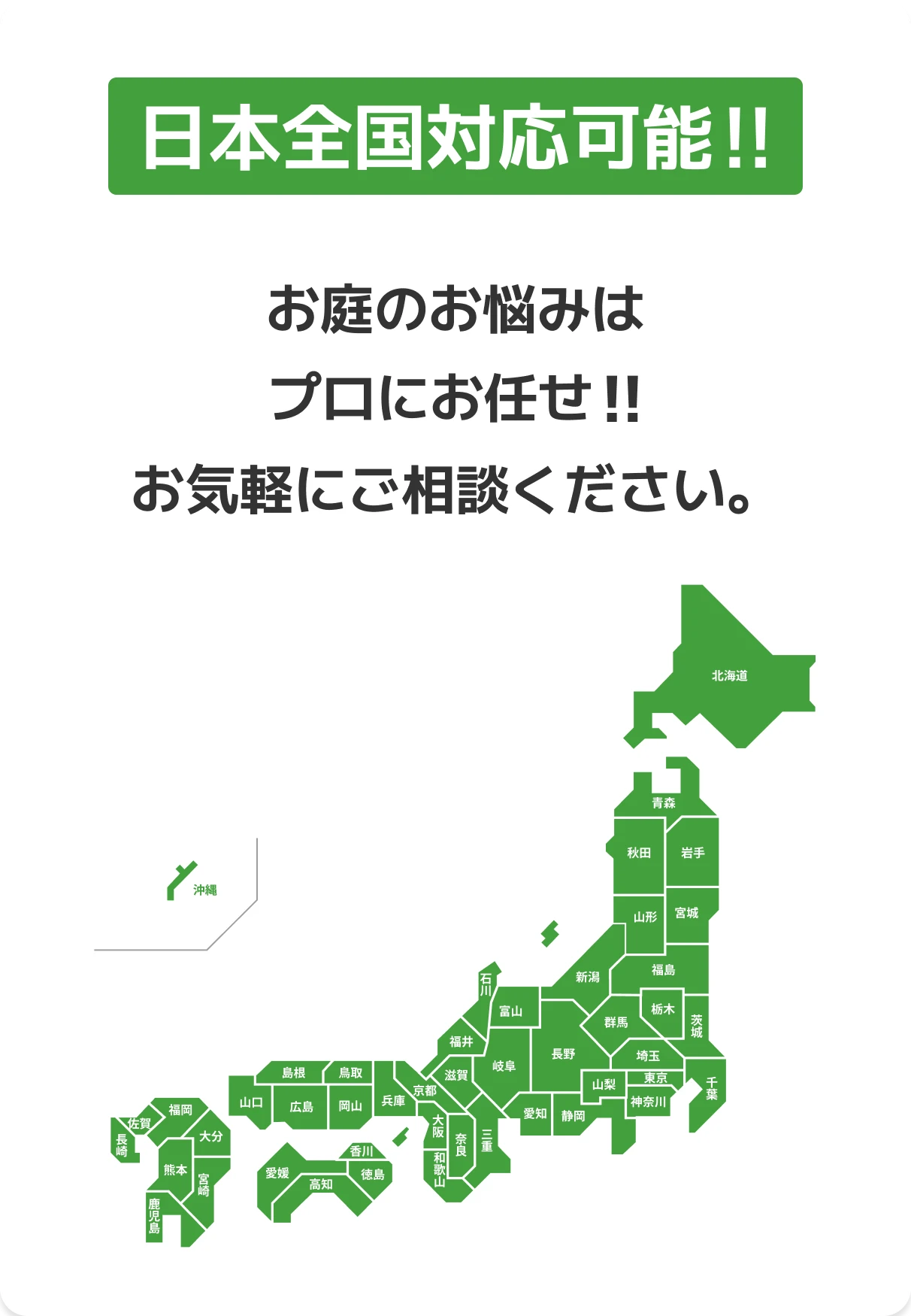 - ご依頼前のご相談・お見積りは無料でございます。どんなことでお困りか、どんな施工をご希望か、まずはお気軽にお問い合わせいただければ早急に担当のお庭のプロよりご回答させていただきますので、お気軽にお問い合わせください。