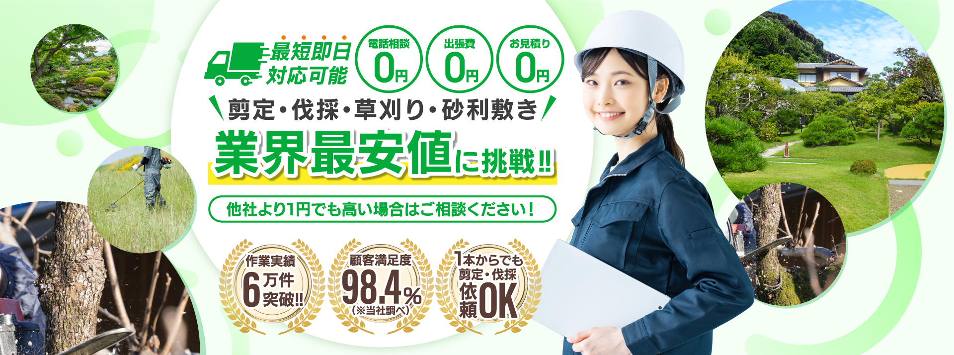 - 事前にご相談をいただければ、予算の範囲内でお庭の手入れをする事が可能です。お庭の一部は自分で手入れをされ、残った高所作業や難しい作業を弊社に依頼するという事も可能ですので、お気軽にお問い合わせください。